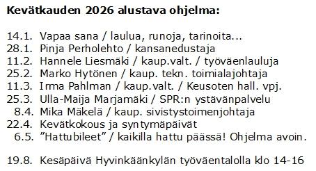 Kevätkaudella 2026 kokoonnumme tiistaisin klo 13-15 Onnensillan Anna-huoneessa 2. krs, ajalla 13.1. - 28.4. Kankurinkatu 4-6, rappu A7 (kulku Värttinäpolun puolelta).